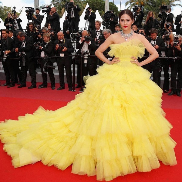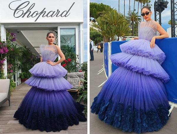 Tại LHP Cannes 2019, Chompoo rực rỡ trong bộ đầm xếp tầng phủ màu tím, tán sắc ombre đến từ Ralph & Russo, bên cạnh đó thương hiệu trang sức cao cấp Chopard cũng tài trợ loạt phụ kiện kim cương, đá cao cấp cho người đẹp trong suốt thời gian diễn ra hoạt động tại LHP Cannes