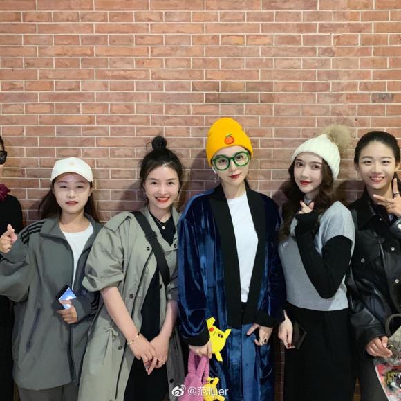 Trước đó không lâu, nữ diễn viên 38 tuổi lại gây ấn tượng khi chọn mũ đội đầu màu vàng có in hình quả cam, đeo kính viền xanh lá khi chụp hình cùng fan hâm mộ