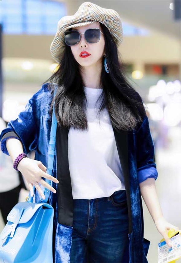 Phạm Băng Băng mới xuất hiện tại sân bay trong áo thun, quần jeans mix đơn giản cùng boots đen và dáng áo khoác ombre dài thu hút sự chú ý của fans