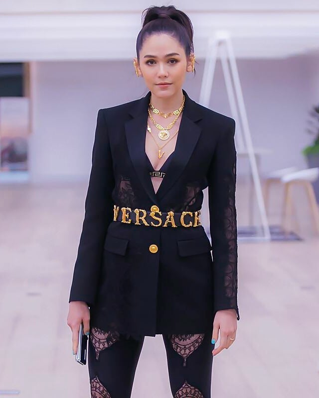 Bà mẹ hai con luôn “dát” trên mình những items đồ hiệu như set đồ Versace trong hình. Cô không hề kén dáng bất kì trang phục nào