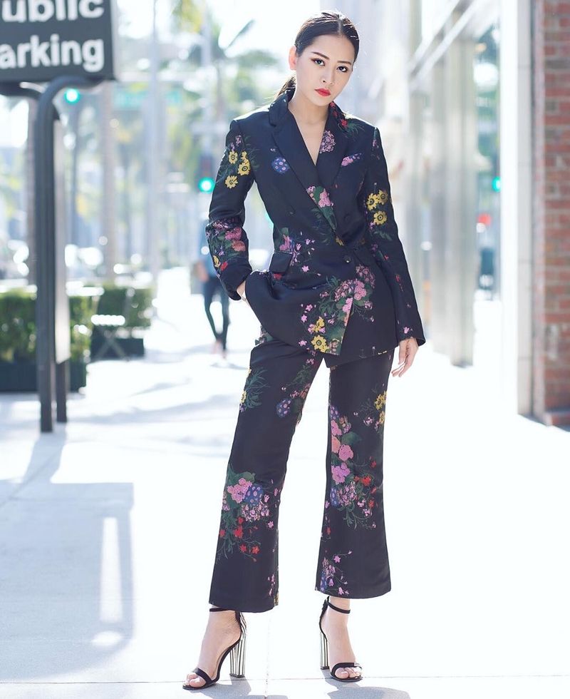Chi Pu mặc thiết kế suits mới nhất trong bộ sưu tập hợp tác giữa H&M và thương hiệu Erdem trên đường phố Los Angeles. Bộ cánh in hoa ton-sur-ton được phối hoàn hảo với sandals gót cao đã đem đến diện mạo mới mẻ cho nàng hot girl đình đám. Không còn vẻ nhẹ nhàng, Chi Pu trở nên sắc sảo, mạnh mẽ hơn song vẫn thanh lịch.