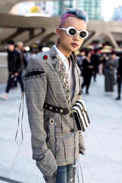 Xuất thân là một stylist, Hữu Anh Zoner dường như phát huy hết sức tưởng tượng cho bộ trang phục bằng cách mix những phụ kiện như giỏ, kính mát cùng quả đầu “bảy sắc cầu vồng” nổi bật.