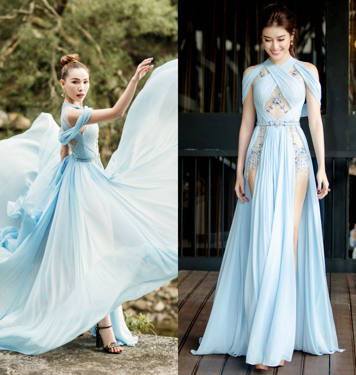 Bên cạnh đó Huyền My còn ăn điểm trong cách tạo dáng. Trong khi đó Quỳnh Thư dường như làm mất đi sự dịu dàng mềm mại của trang phục khi có những cách tạo dáng không phù hợp.