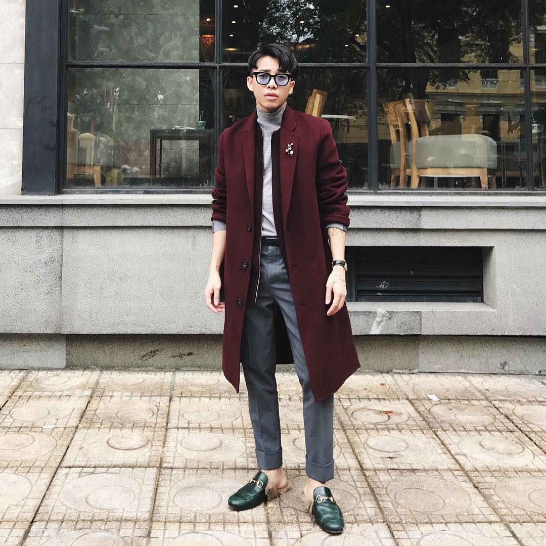 Cách mix yêu thích của anh chàng là phối đôi giày này cùng với quần ống ôm, áo khoác dáng dài và áo phông bên trong.