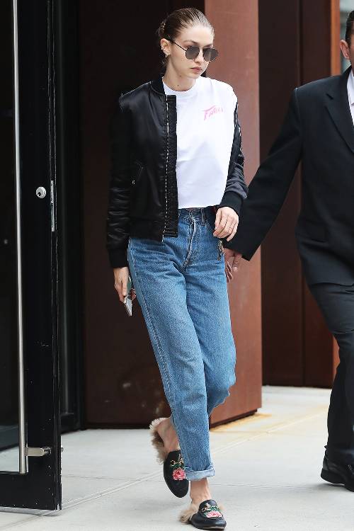 Gigi Hadid cũng có cho mình một đôi loafer đính lông của Gucci giống Hoàng Ku. Thế nhưng, khác với cách mặc thanh lịch của anh chàng stylist, nữ siêu mẫu lại lựa chọn phối cùng quần baggy và áo thun, áo khoác da nhằm tạo nét năng động.