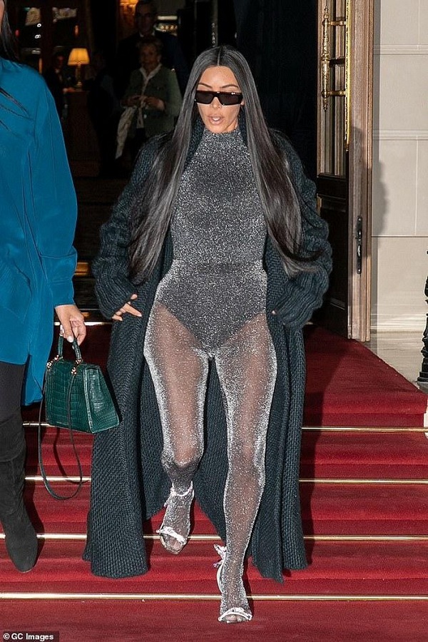 Xu hướng thời trang khó hiểu trong bộ bodysuit với chất vải lạ mắt sần sùi và có ánh bạc lấp lánh tại Paris tối qua của cô Kim vòng ba