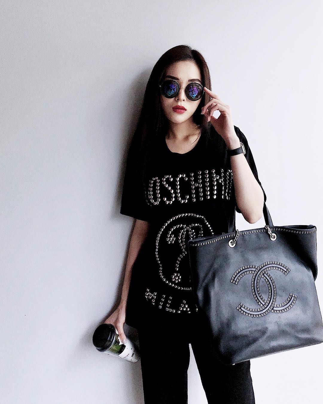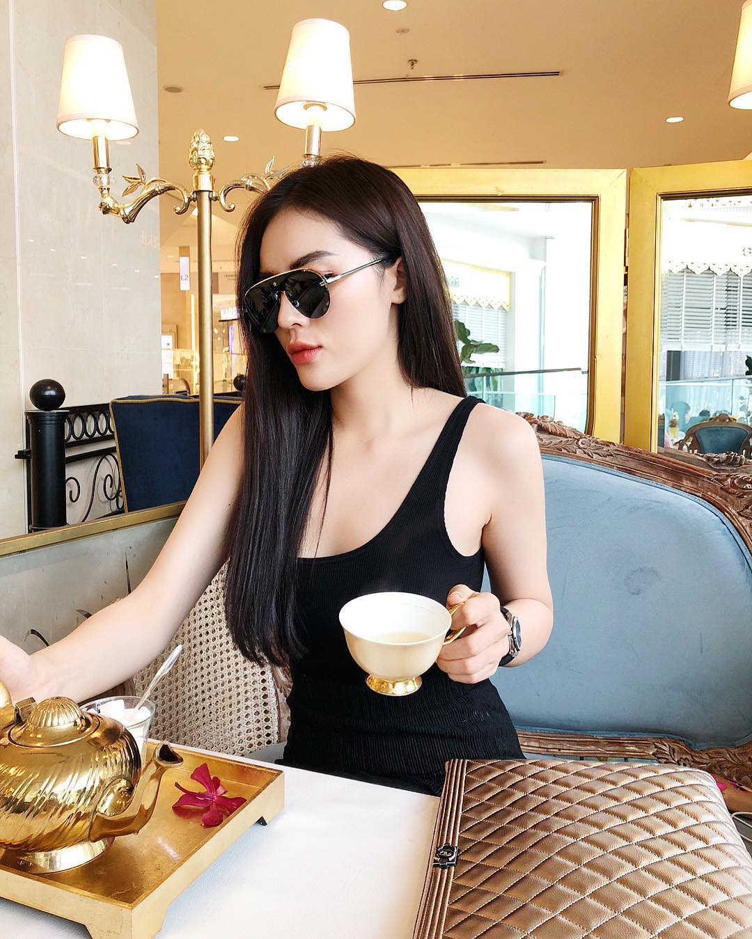 Kính mát kiểu dáng tròn của thương hiệu gucci cũng cực kì phù hợp với gương mặt sắc sảo của Kỳ Duyên. Nguyên một cây đen nhưng vẫn rất phong cách và thời thượng.