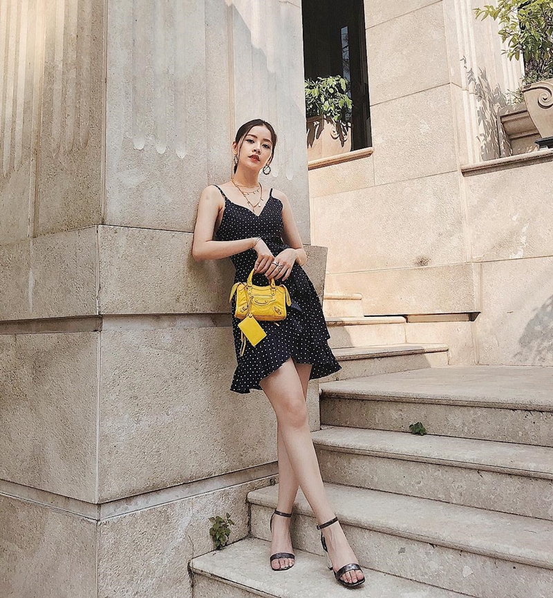 Chi Pu sành điệu với chiếc túi Balenciaga tông màu vàng sáng làm phụ kiện nâng tầm bộ đầm đen hoạ tiết chấm bi.