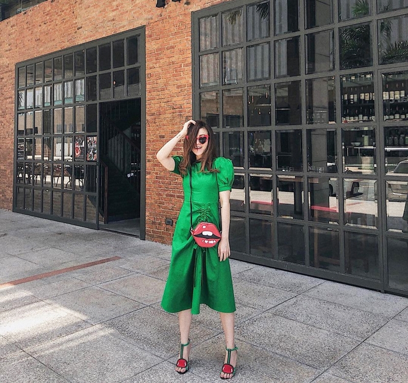 Ca sĩ Yến Nhi chọn cho mình bộ đầm xanh lá cây hơi hướng retro cùng cái túi hình đôi môi đỏ nổi bật.