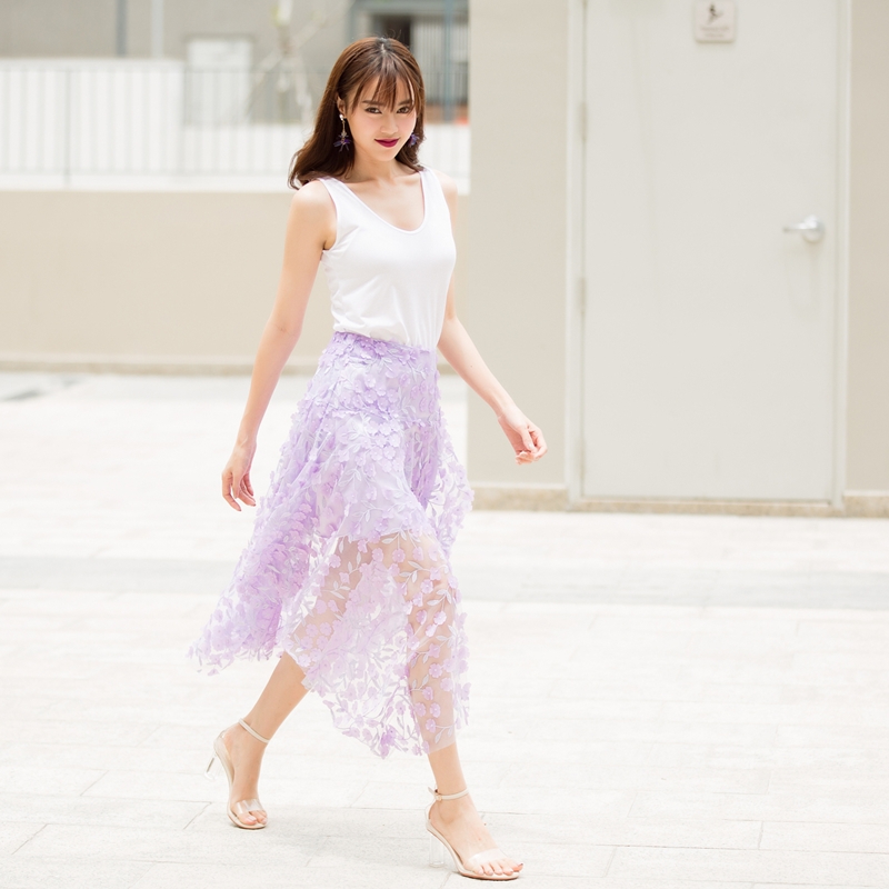 Ninh Dương Lan Ngọc duyên dáng với đầm sát nách trắng, phối layer phá cách với chân váy xuyên thấu màu tím phấn.