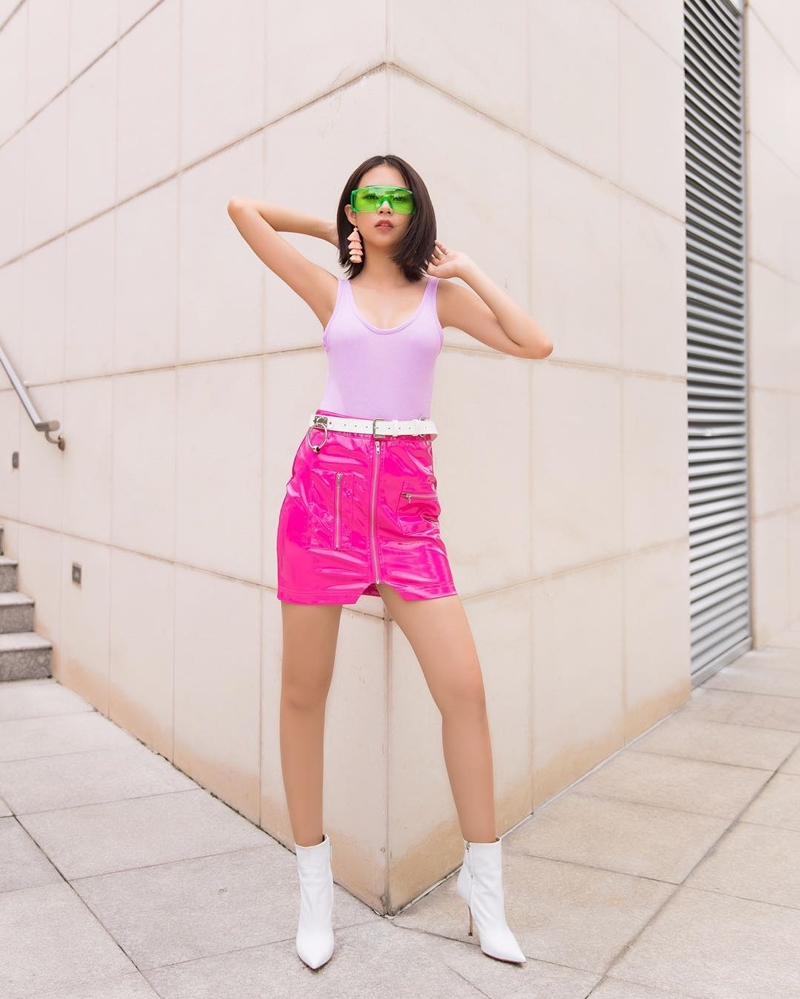 Phí Phương Anh với trang phục áo sát nách dáng ôm màu phấn, mix ấn tượng với chân váy da hồng neon cùng với phụ kiện nổi bật là chiếc mắt kiếng xanh lá cây với vóc dáng vô cùng nuột nà.