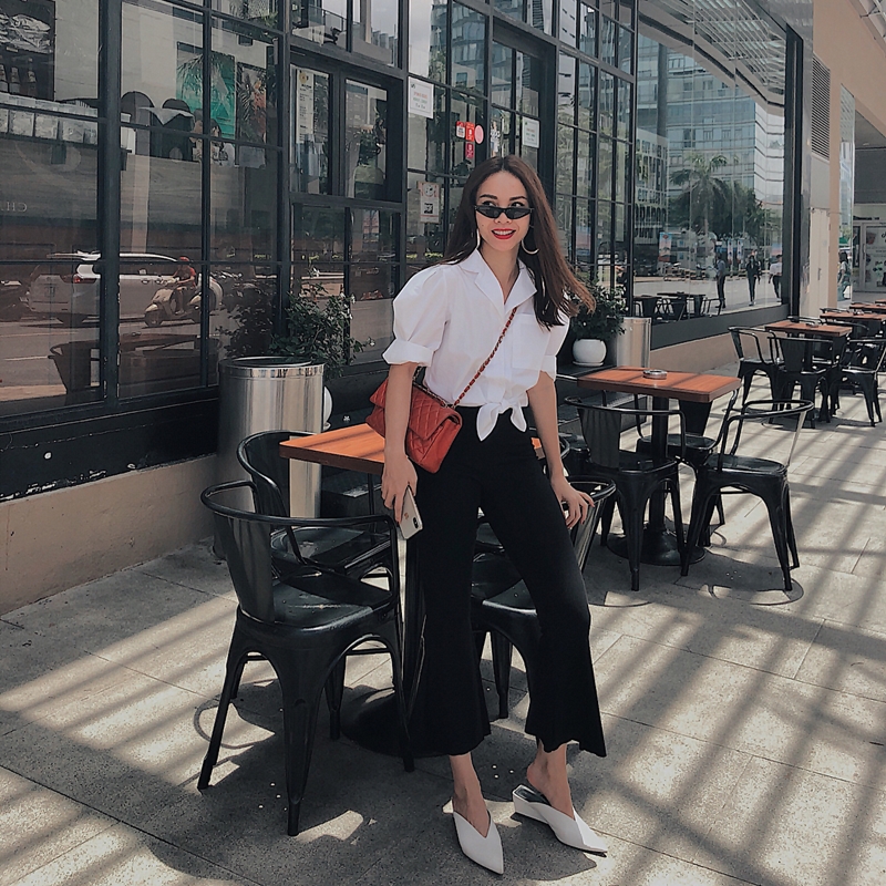 Không kém cạnh cô em gái, Yến Trang chọn cho mình phong cách vintage khi buộc vạt mẫu sơ mi trắng tay bồng, kết hợp cùng quần lửng ống rộng và chiếc túi đỏ nổi bật