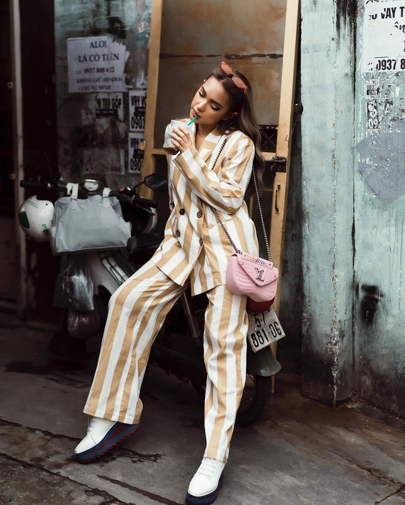 Suit với kiểu quần ống rộng và có tông màu sáng cũng là “vũ khí” thời trang của Châu Bùi trong buổi dạo phố tuần qua, tô điểm nổi bật bằng chiếc túi New Wave mới toanh từ thương hiệu Louis Vuitton.