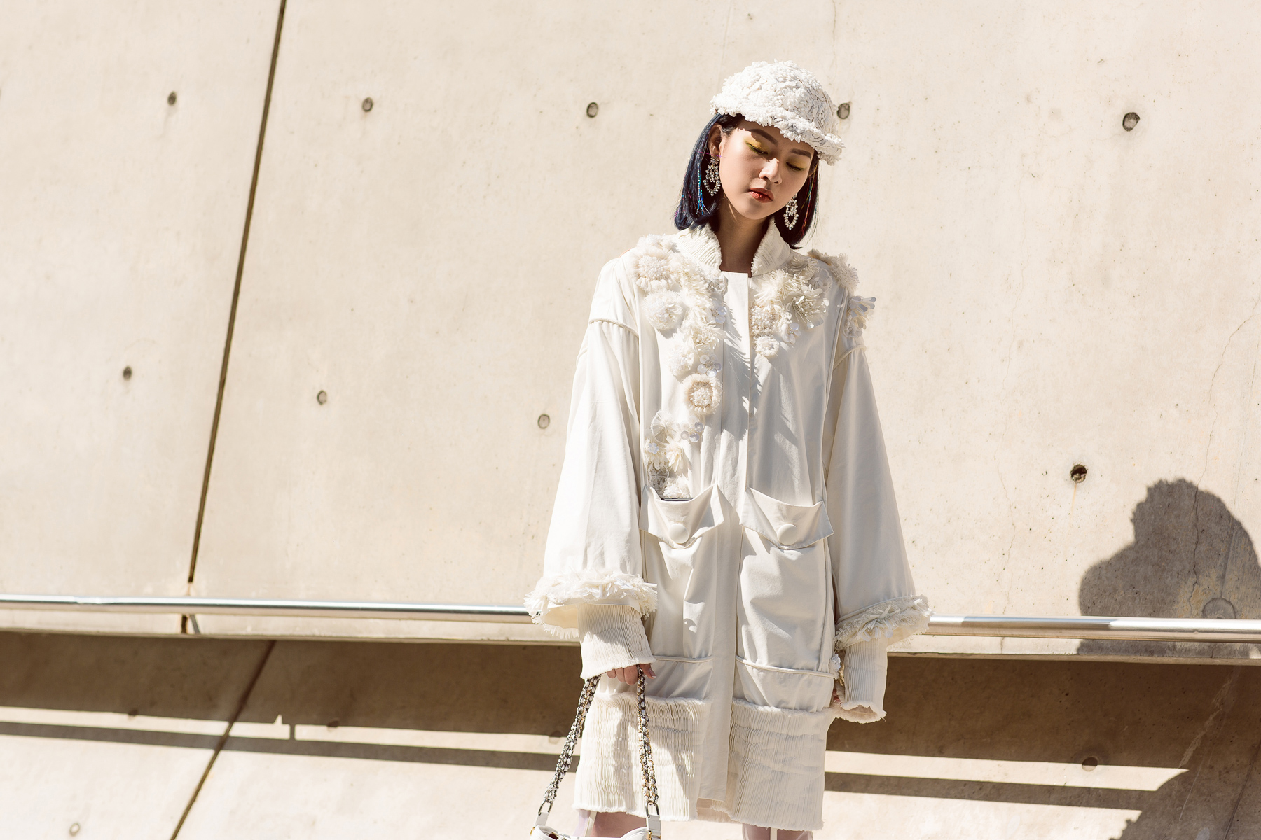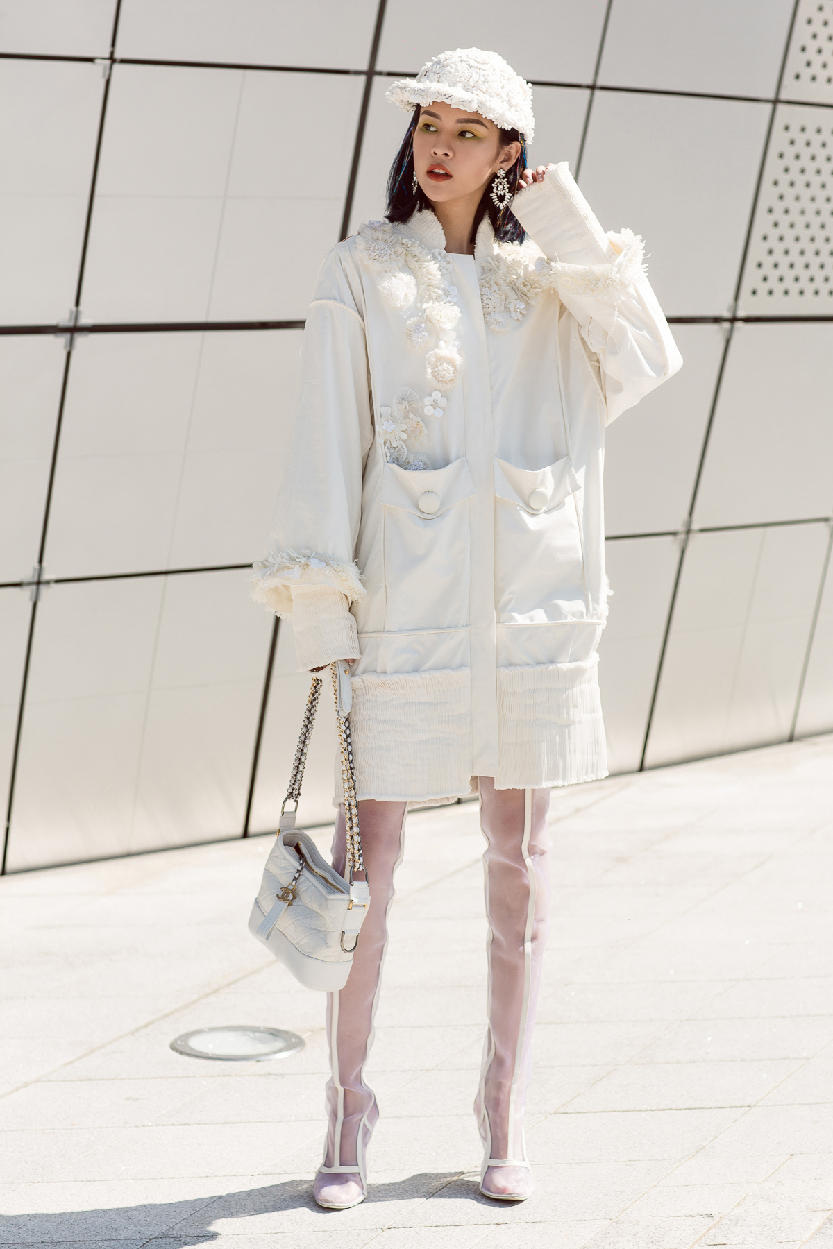 Bằng chứng, bên cạnh bộ cánh Em hoa trắng tinh với hoạ tiết hoa thêu nổi tinh xảo, được hoàn thiện từ bàn tay Công Trí thì Phí Phương Anh còn ưu ái diện boots của nhà thiết kế Ivan Trần và mũ của Nguyễn Minh Công.