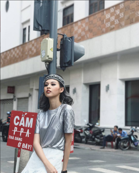 Cô biểu cảm cực cuốn hút thể hiện đúng tinh thần của trang phục trong tông màu lạnh của metallic.