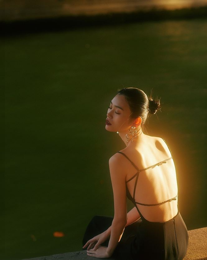 Cô diện đầm đen khoe lưng trần và vòng eo nhỏ xíu.