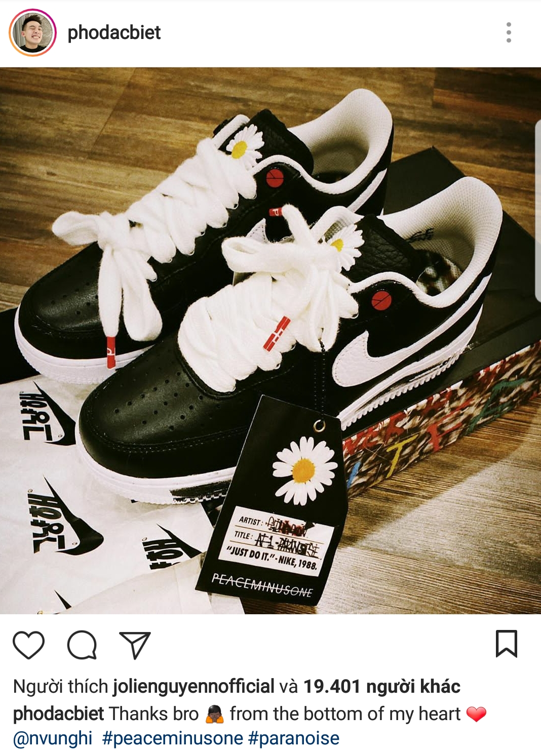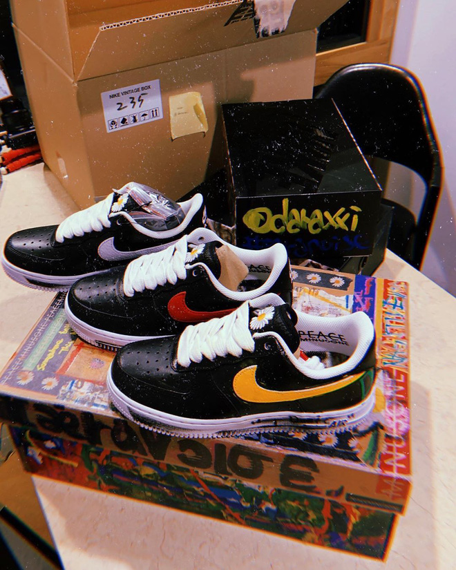 Mấy ngày vừa qua, đôi giày Nike Air Force 1 x PEACEMINUSONE Para-noise của G-Dragon thật sự đã tạo nên một “cơn sốt” với các tín đồ mộ điệu. Sản phẩm có 3 phiên bản được đánh dấu theo các màu của dấu swoosh trắng, đỏ vàng. Trong đó, đôi swoosh trắng được phát hành trên toàn cầu, swoosh đỏ chỉ có 818 đôi và chỉ mở bán cho người coq sồ điện thoại, hộ khẩu Hàn Quốc, còn đôi swoosh vàng để dành tặng bạn bè, người thân. Hiện tại, đây là những đôi giày cực kỳ khó mua, được dân tình lùng sục.
