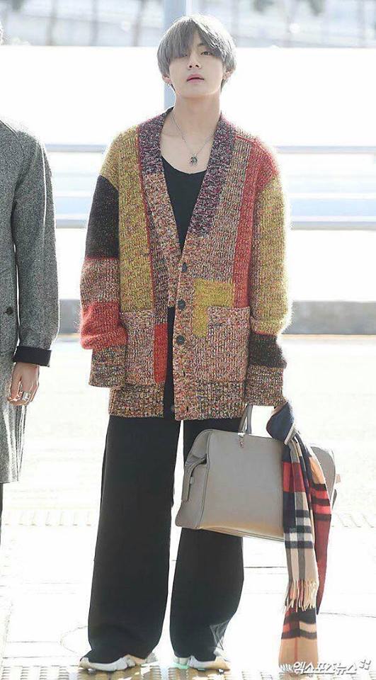 Thời trang sân bay của V thì khá là thoải mái. Anh chàng luôn diện quần thụng với áo rộng mỗi lần xuất hiện.