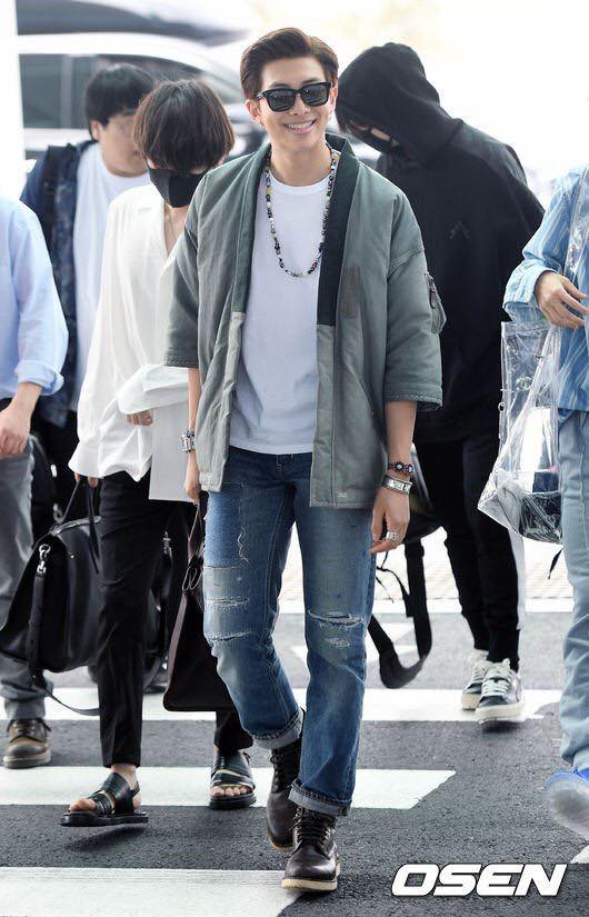 RM cực kì thích mặc đồ dày để trông mình 'bự con' vì thế lúc nào RM cũng được nhìn thấy với những chiếc áo khoác bên ngoài. Trang phục sân bay của RM chủ yếu từ các thương hiệu thời trang lớn của Nhật như Kapital, Visvim.
