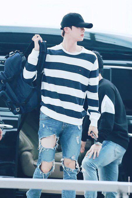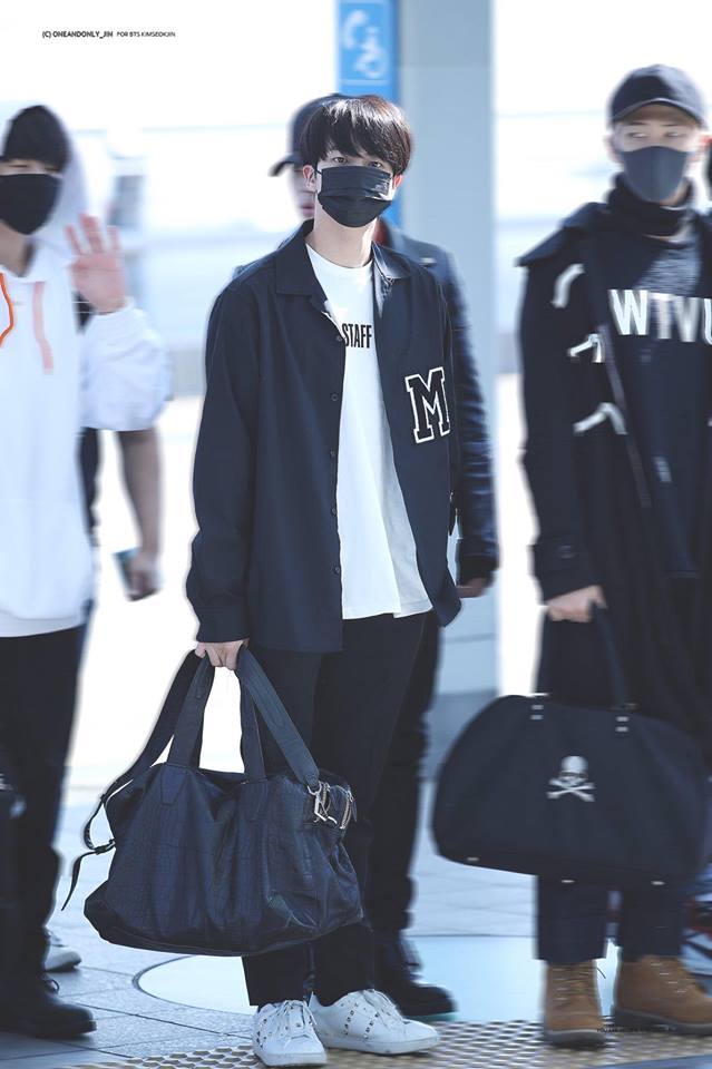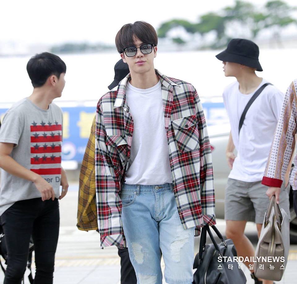 Sở hữu body chuẩn và bờ vai rộng, thế nhưng thời trang sân bay của Jin lại vô cùng đơn giản.Phong cách quen thuộc của Jin mỗi lần ra sân bay là áo thun hay hoodie phối cùng áo khoác.