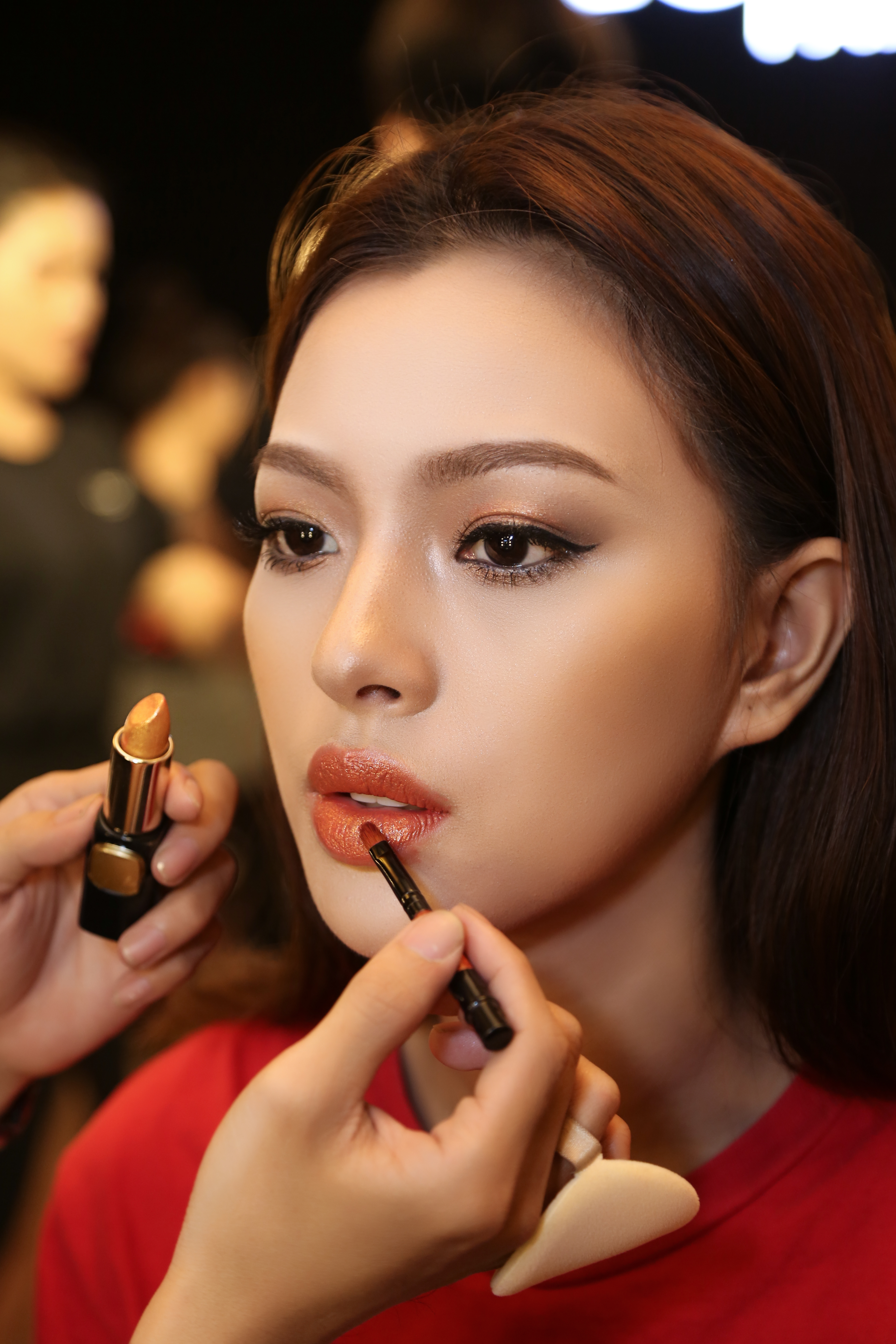 Tú Hảo chăm chú make up đôi môi với hình ảnh mới lạ trong thử thách tập 2 của chương trình. Với lợi thế về “đôi môi dày” quyến rũ, màu son Nude kết hợp lớp nhũ vàng lấp lánh càng làm Tú Hảo nổi bật vẻ đẹp thanh tú của mình.