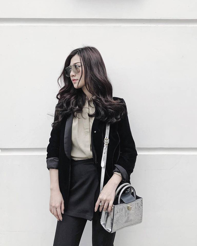 Á hậu Tú Ánh xuống phố với cây trang phục tông màu trầm. Cô diện áo vest nhung khá tiệp cùng phong cách. Phụ kiện là chiếc túi hàng hiệu làm điểm nhấn.