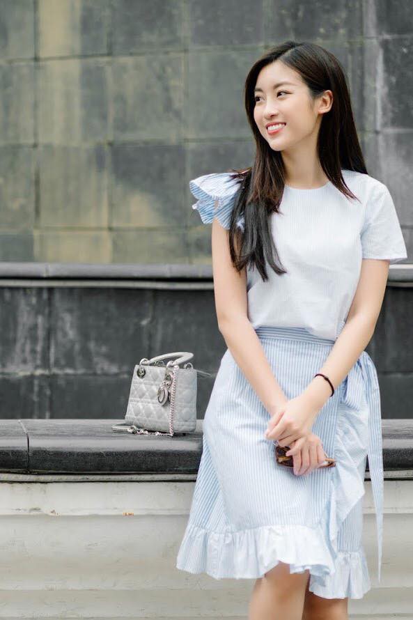 Đỗ Mỹ Linh duy trì phong cách nhẹ nhàng với bộ cánh tông màu xanh nhạt. Hoa hậu để kiểu tóc suông thẳng kèm trang điểm nhẹ cũng rất ăn nhập với tổng thể. Đồng thời, phù hợp không khí mùa hè.