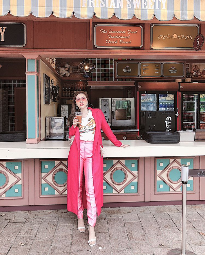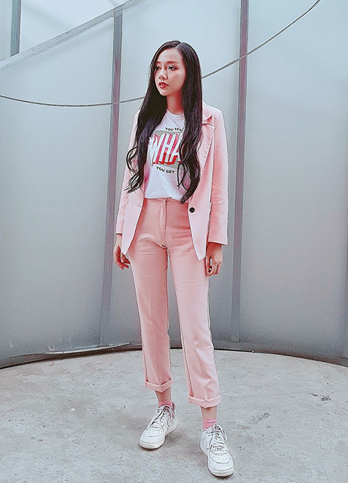Bảo Thy là một trong những tín đồ cuồng màu hồng trong showbiz. Lần này, cô diện quần chất liệu taffa kết hợp áo thun trắng. Áo khoác bên ngoài gam màu hồng rực rỡ giúp người mặc nổi bật trên đường phố.