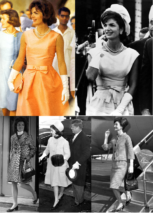 Bà Jackie Kennedy (1929-1994) là vợ của tổng thống thứ 35 của Hoa Kỳ John F.Kennedy trong nhiệm kỳ 1961-1963. Chồng bà đã bị ám sát vào tháng 11/1963. Bà Kennedy được tôn vinh là biểu tượng thời trang của những năm thập niên 60. Phong cách của bà hiện diện cho sự quý phái, thanh cao của một đệ nhất phu nhân. Thời đó, bà chuộng những món đồ của hãng thời trang nổi tiếng như Dior, Gucci, Hermès.