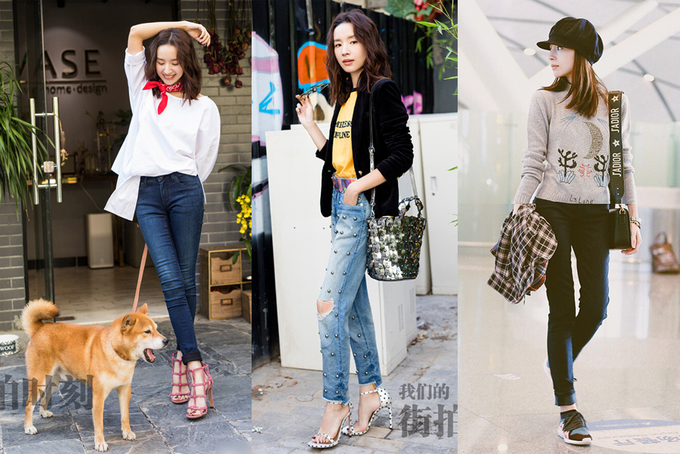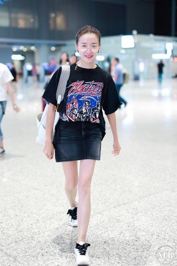 Trái ngược với vẻ nữ tính mà sang trọng trên thảm đỏ, phong cách thường ngày của Đổng Khiết lại được cô hướng tới sự trẻ trung, năng động nhưng không kém phần khỏe khoắn như áo thun và váy jeans.