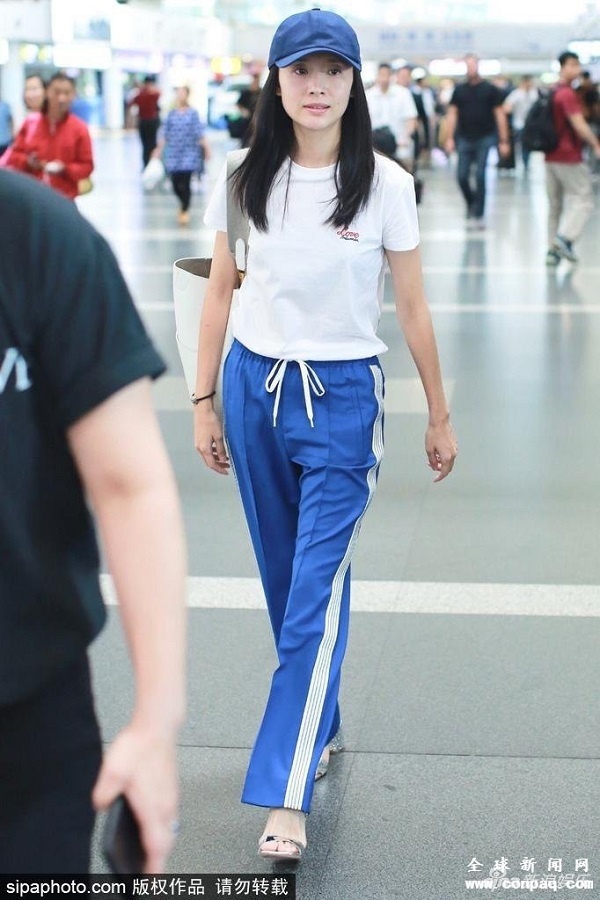 Thời trang sân bay của Đổng Khiết đơn giản khi mix trang phuc không hề cầu kì với áo thun và quần thể thao hai sọc