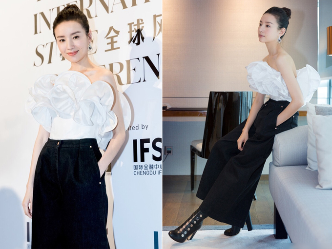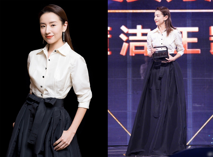 Váy đen trắng kiểu dáng thanh lịch thường được cô lựa chọn mặc khi tham gia các sự kiện lớn hoặc nhỏ, nếu để ý Đổng Khiết thường ít sử dụng trang sức phụ kiện cầu kì