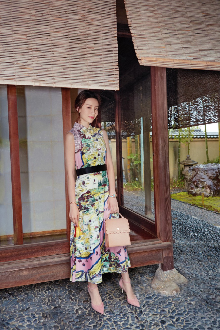 Đổng Khiết trở nên nữ tính và sành điệu tuyệt đối với chiếc đầm họa tiết rực rỡ và nhấn nhá túi xách, giày cao gót tông xuyệt tông.