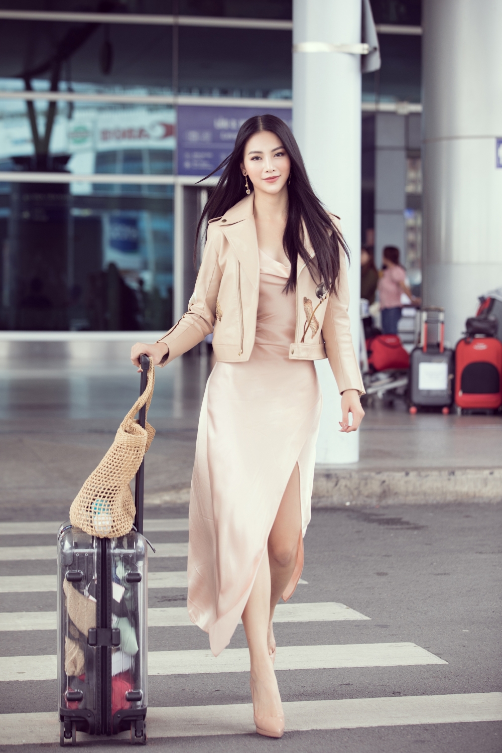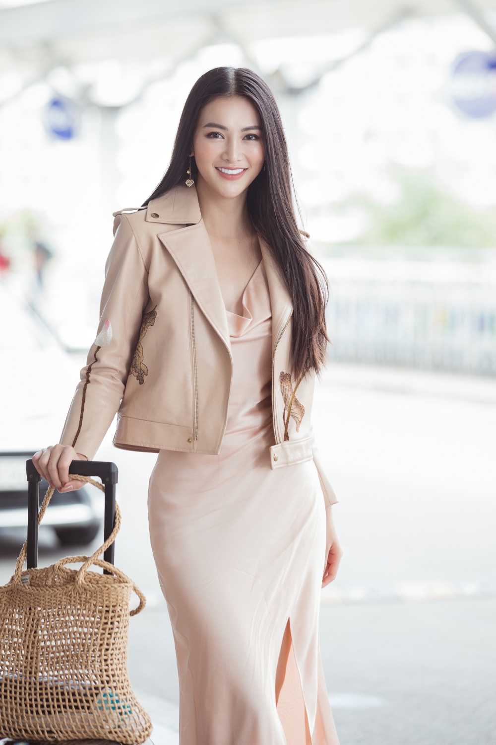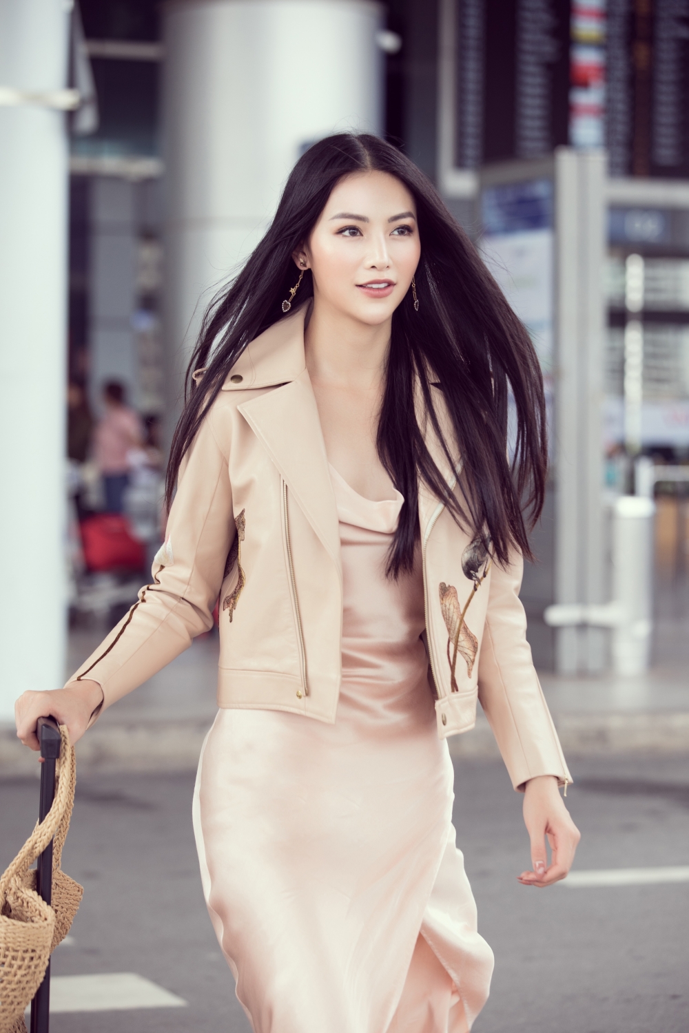 Diện bộ váy quyến rũ, Phương Khánh còn được khen ngợi khi phối áo khoác da ton-sur-ton khi xuất hiện tại sân bay quốc tế. Với chiếc túi cói quen thuộc, nàng hậu là một trong những hoa hậu nói không với túi da nhằm bảo vệ thiên nhiên và hệ sinh thái.