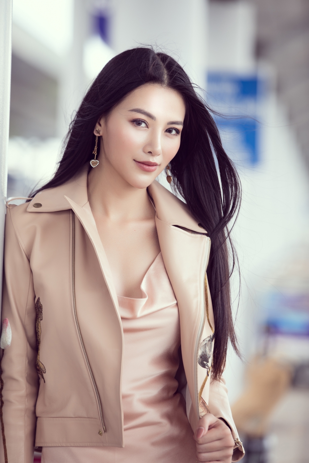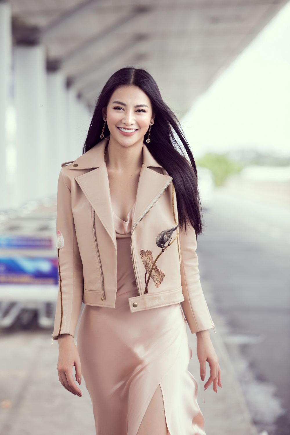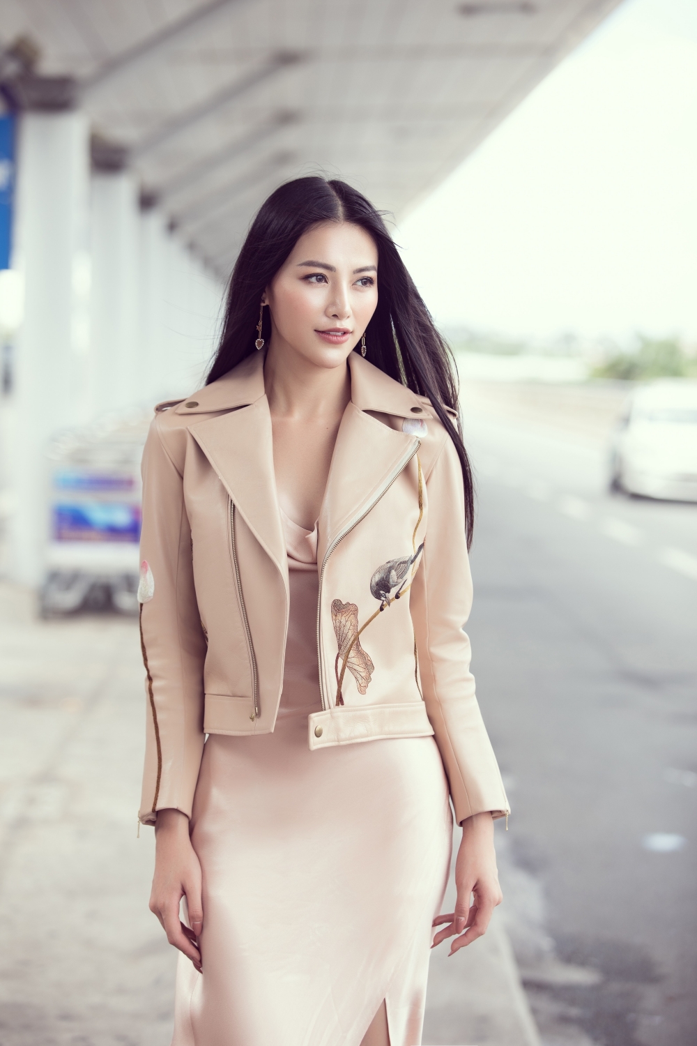 Diện bộ váy quyến rũ, Phương Khánh còn được khen ngợi khi phối áo khoác da ton-sur-ton khi xuất hiện tại sân bay quốc tế. Với chiếc túi cói quen thuộc, nàng hậu là một trong những hoa hậu nói không với túi da nhằm bảo vệ thiên nhiên và hệ sinh thái.