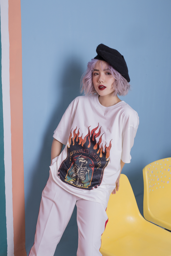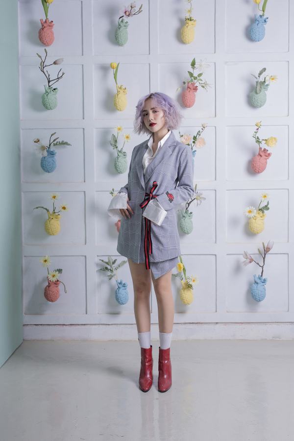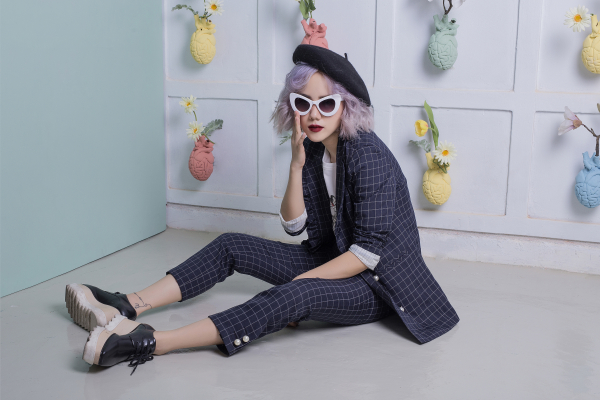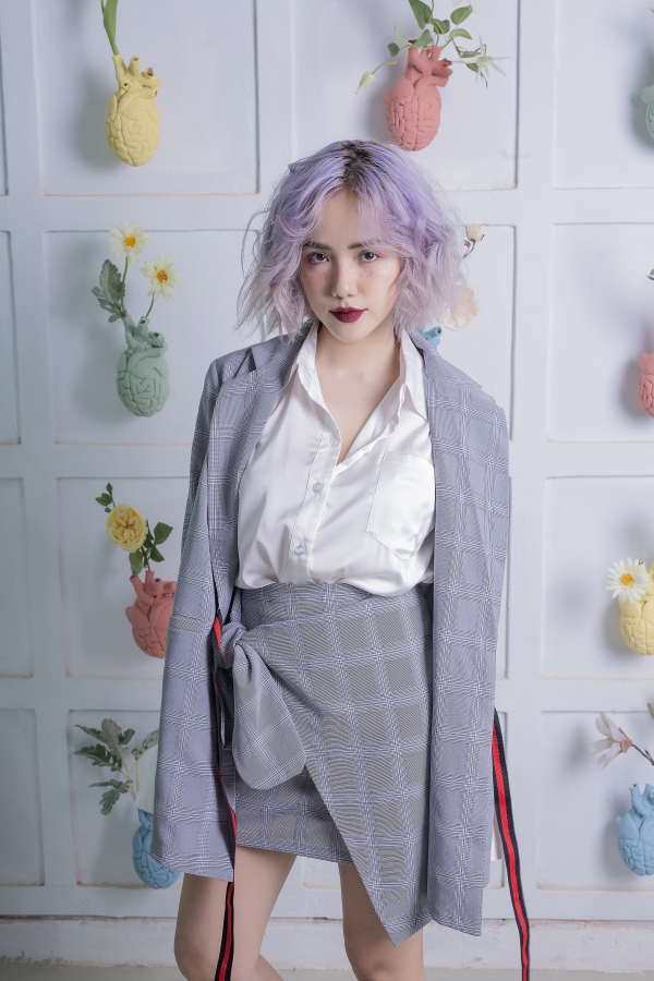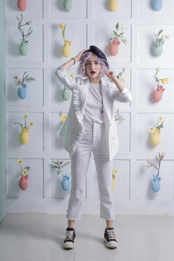 Có vẻ những bộ suit phá cách rất hợp với Phương Ly, phụ kiện kính mắt mèo Pop Colour cùng mũ nồi đều dễ dàng xuất hiện với chủ đề này!