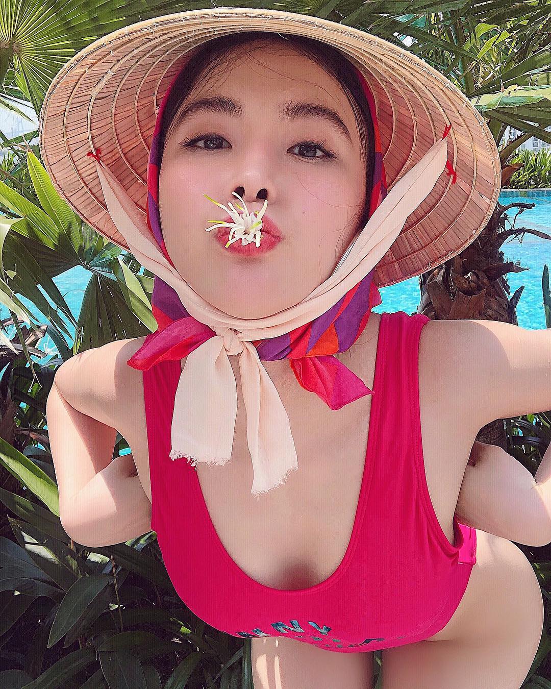 Angela Phương Trinh chắc hẳn đã tìm ra cho mình một cách diện áo tắm hoàn toàn mới, đảm bảo sự nổi bật trong những bức ảnh, đó là phối nón lá cùng khăn quấn đầu, tiệp màu trang phục.