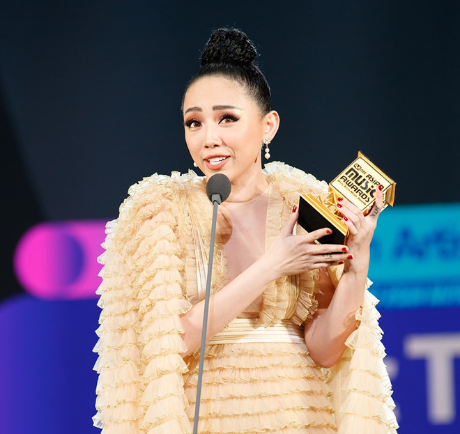 Họat động không ngừng nghỉ trong suốt một năm qua khiến Tóc Tiên xuất sắc vượt mặt hàng loạt những tên tuổi đình đám khác để nhận giải Nghệ sĩ châu Á xuất sắc nhất Việt Nam tại MAMA 2017. Cô nàng tết lại tóc và búi cao lên đầy sang trọng đối với một sự kiện mang tính quốc tế như lễ trao giải MAMA 2017.