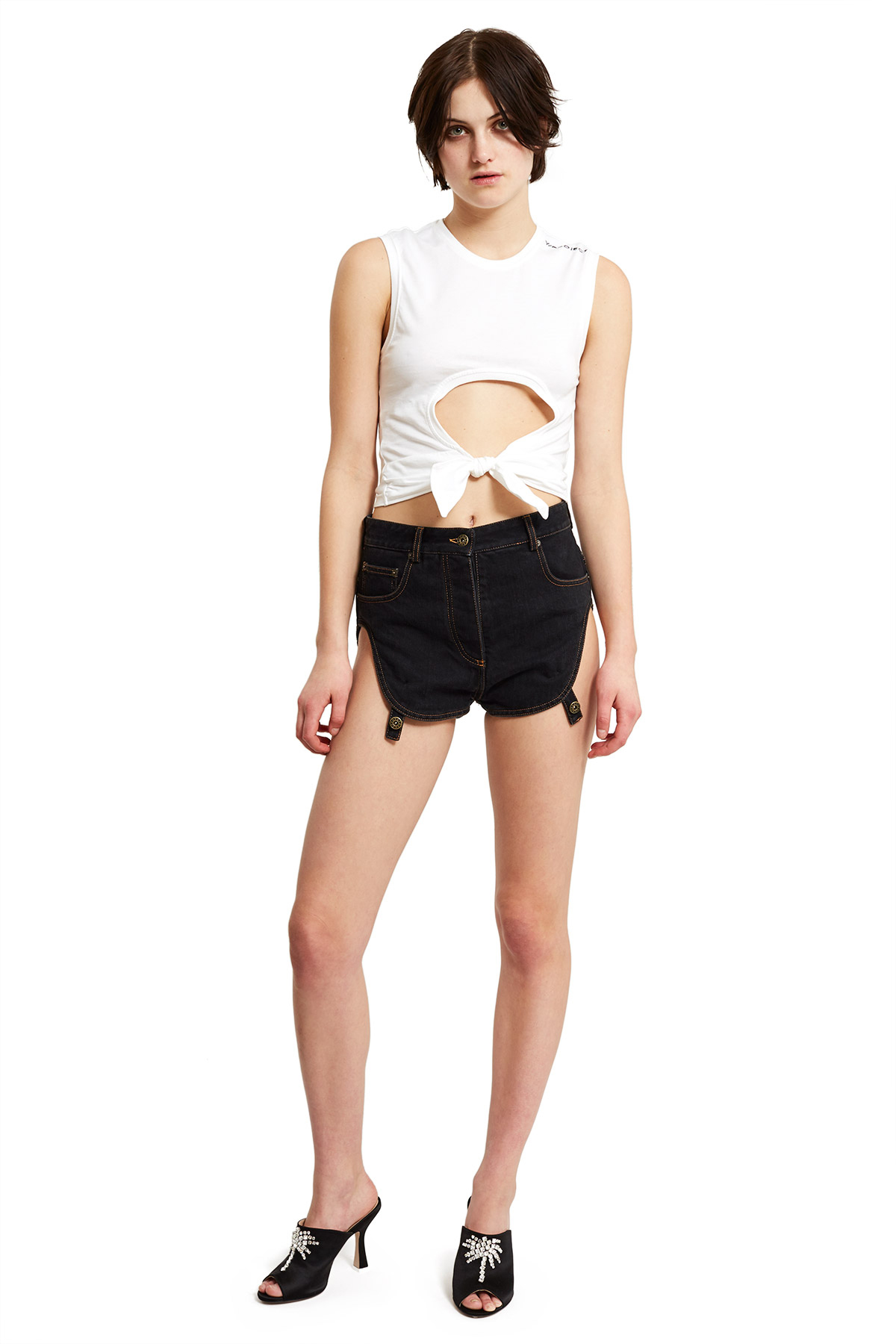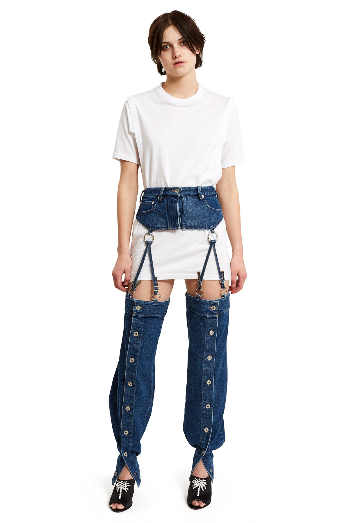 Cùng là kiểu 2 trong 1 và chung nơi sản xuất là Y/Project, chiếc quần jeans dây đai này còn khó mặc hơn kiểu quần ghép nối 2 mảnh. Ống quần mô phỏng hình dáng của thigh high boots, được gắn kết với phần cạp quần trên bằng dây đai chữ O.