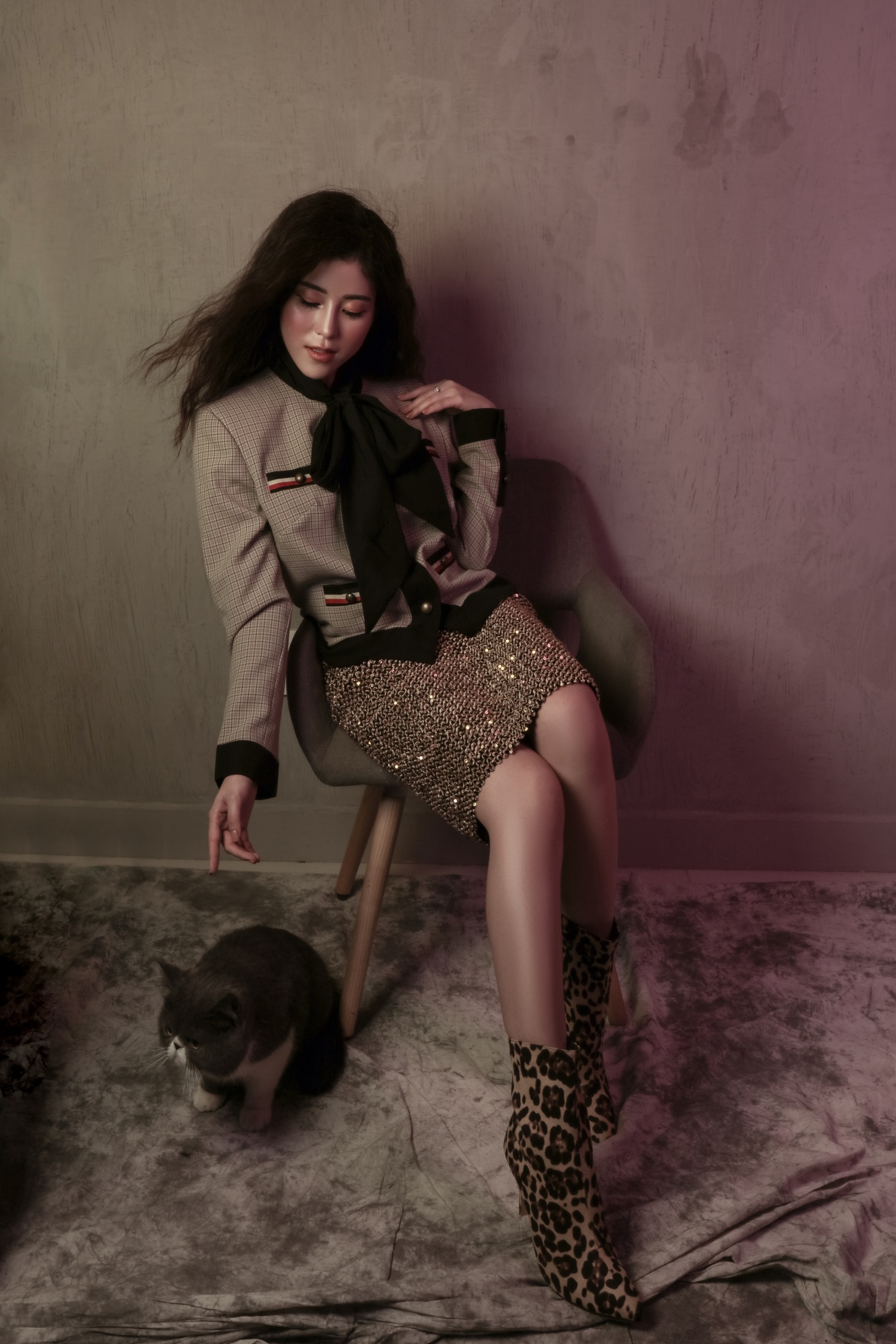 Ngọc Anh khéo léo lựa chon áo khoác phối với chân váy sequin ánh vàng rực cùng đôi boots da beo thời thượng