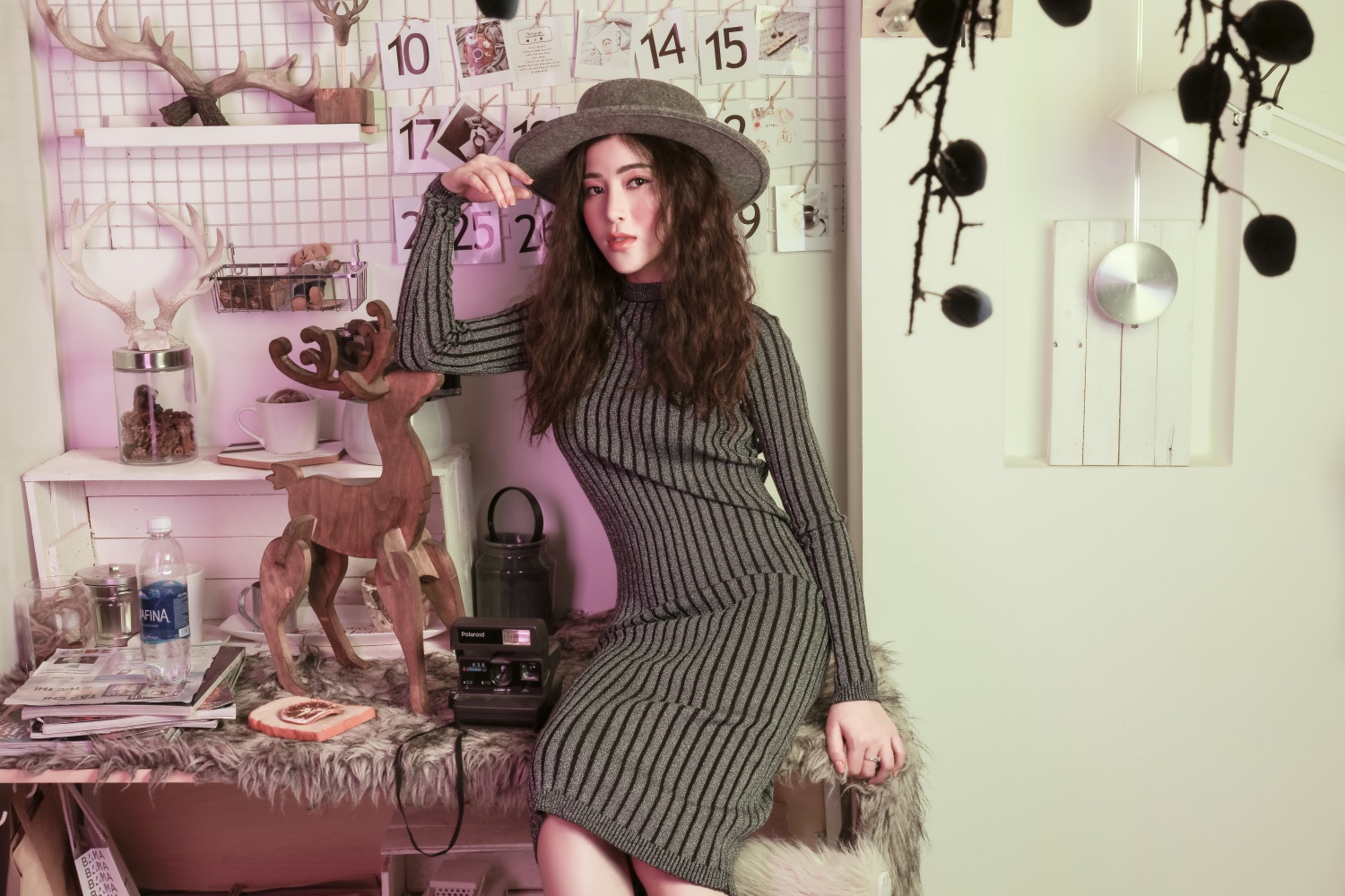 Phụ kiện mũ Fedora màu xám phối cùng với trang phục làm tổng thể của cô nàng vô cùng xinh xắn và đáng yêu
