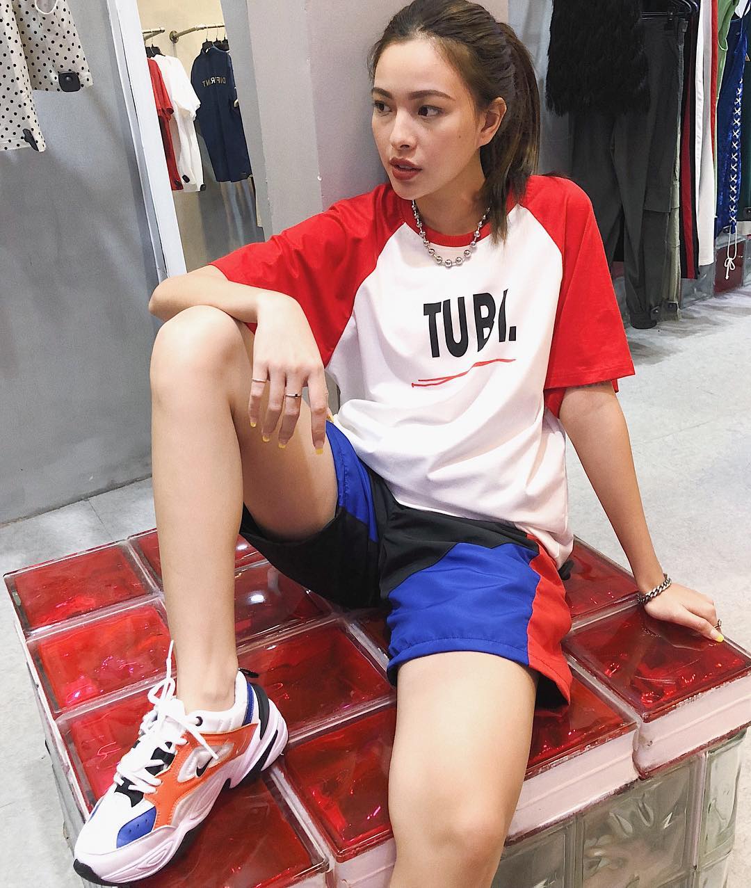 Cùng là cách chơi màu sắc nhưng Tú Hảo lại trông thú vị và đáng yêu với áo phông, quần short và giày thể theo chạy theo bảng màu xanh dương, đỏ.