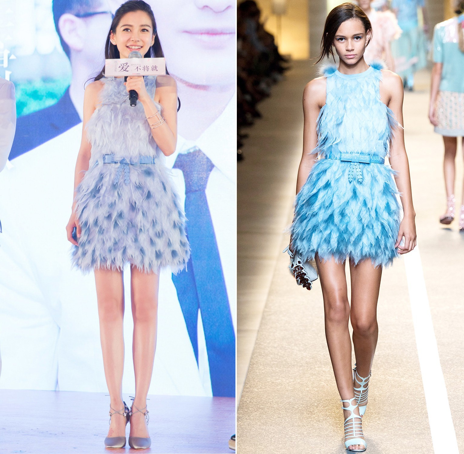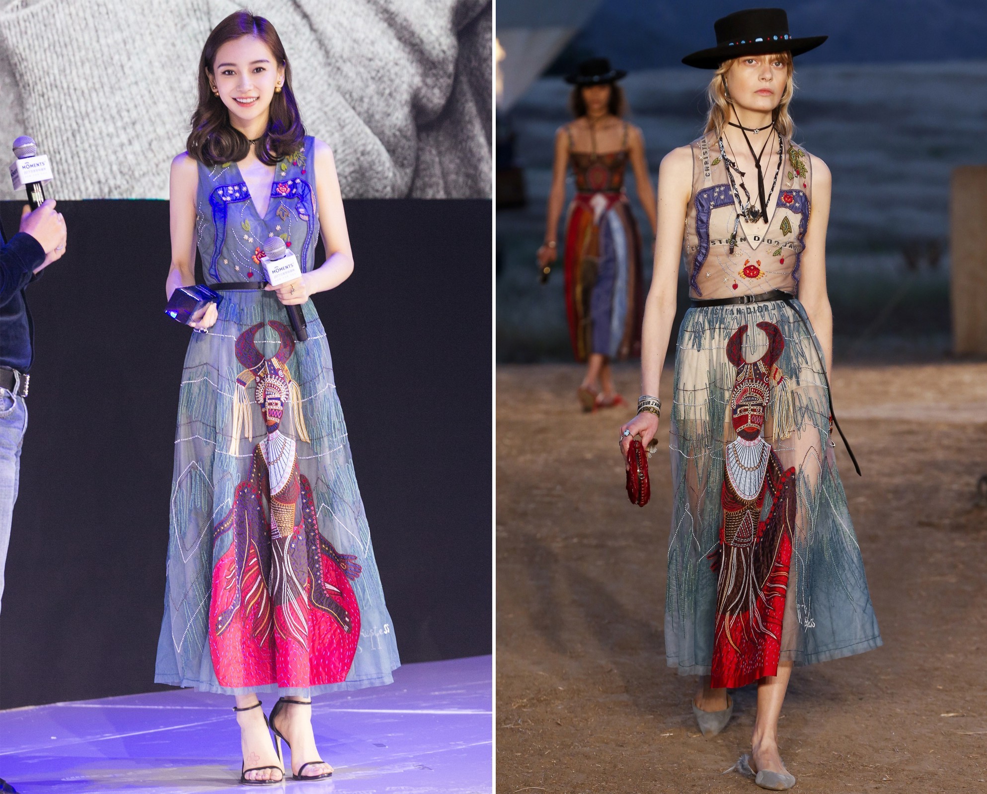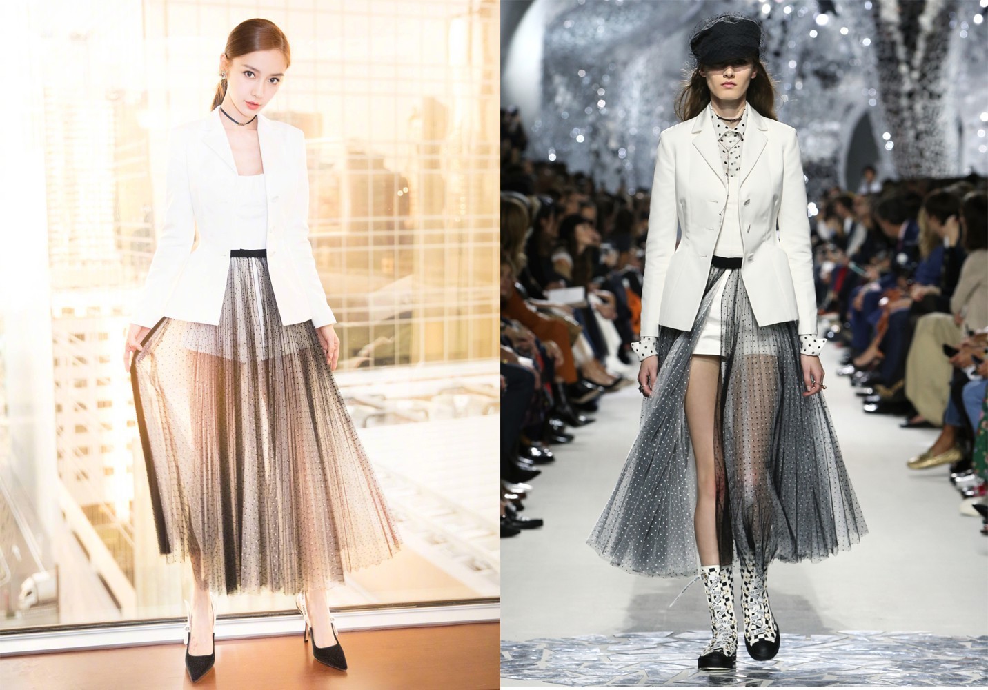 Người đẹp không ngần ngại diện lại “y đúc” trang phục mà người mẫu đã trình diễn trên sàn runway. Trong set trang phục này có lẽ câu nói “Thần thái vẫn là quan trọng nhất” không sai vào được đối với bà xã Huỳnh Hiểu Minh. Chỉ hơi khác ở phụ kiện là mũ và mắt kính, tuy nhiên có lẽ chính thần thái mới là điều mà Angela Baby “ăn đứt” người mẫu trong bộ cánh này.