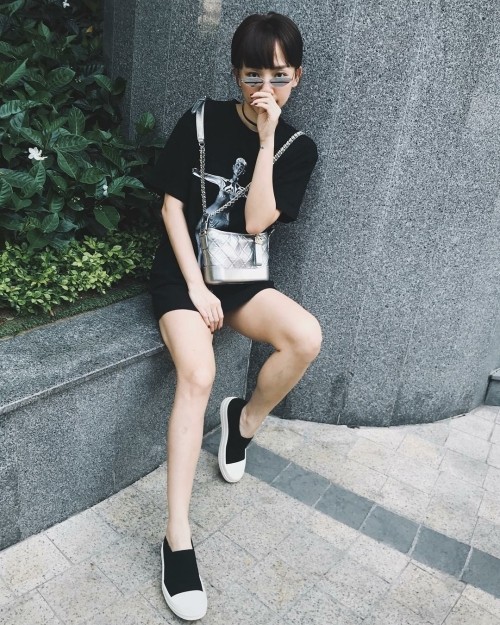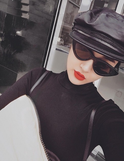 Bảo Anh dù âm thầm không mấy khi khoe hàng hiệu nhưng cũng rinh một em kính mắt mèo về để trưng diện. Cô kết hợp cả cây đên với áo thun body và mũ baker boy .