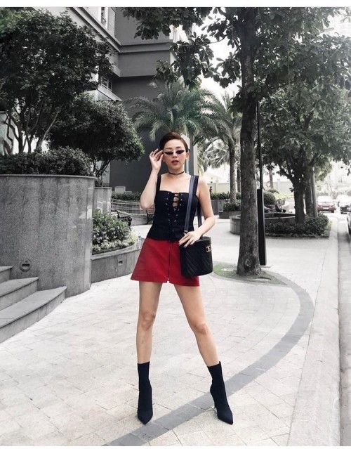 Ngay cả khi diện váy màu đỏ “bánh bèo” thì Tiên vẫn kết hợp rất ngọt kiểu kính cá tính này với áo đan dây sexy.