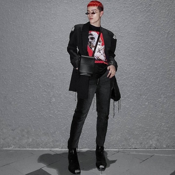 Diện cả cây đen, Tóc Tiên tạo điểm nhấn bằng kính tròng nhỏ và đôi giầy Balenciaga hầm hố.