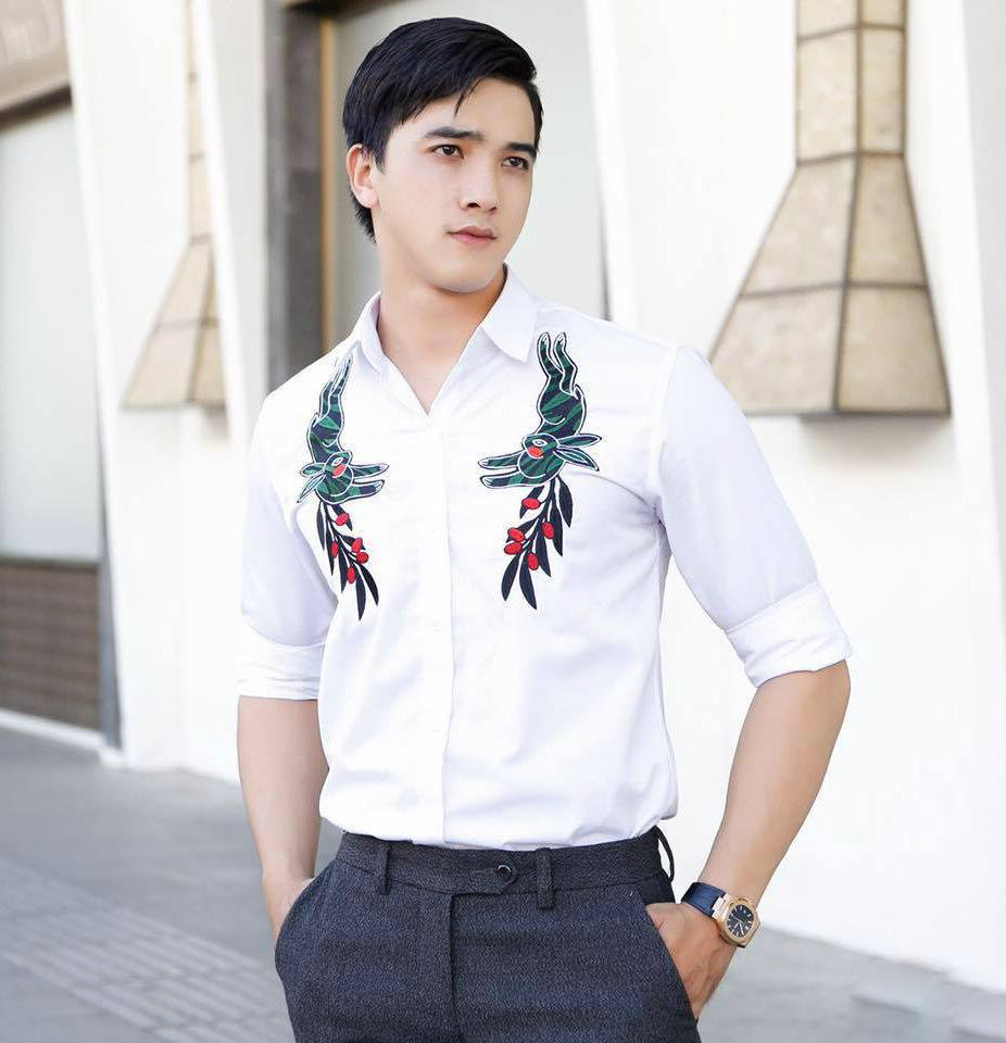 Vẻ soái ca của anh chàng càng được nhân lên gấp bội trong chiếc áo sơ-mi trắng được thêu họa tiết động vật. Phom dáng áo ôm vừa phải giúp nam diễn viên khoe vóc dáng rắn rỏi.