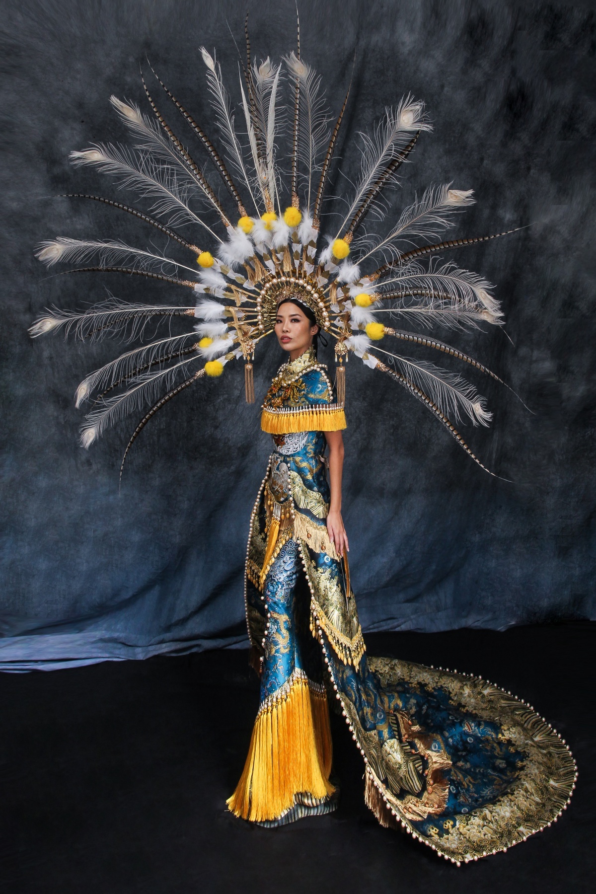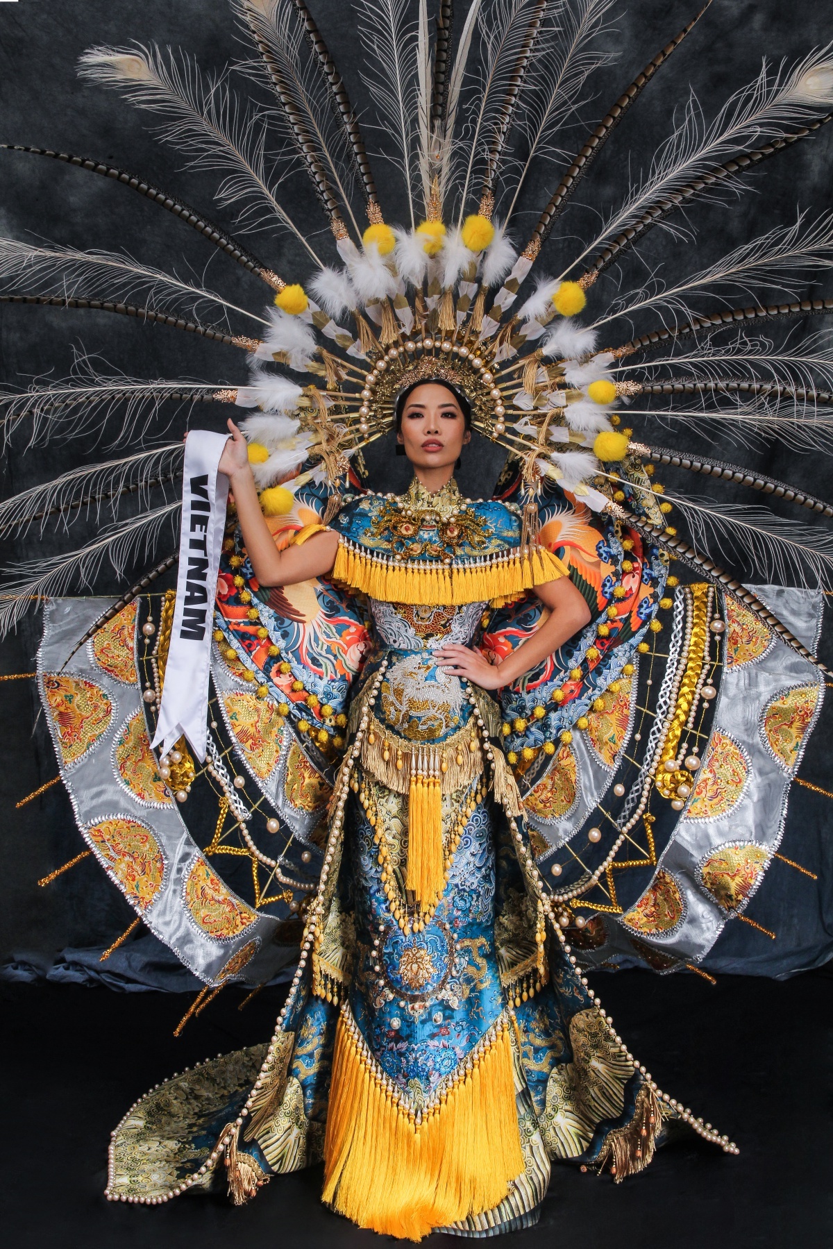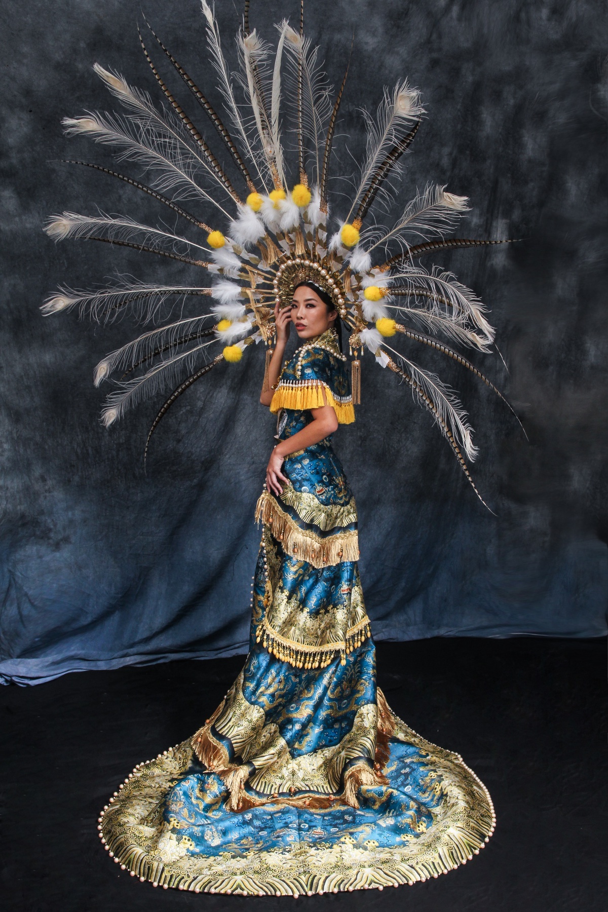 Lấy cảm hứng từ tuồng cổ - bộ môn nghệ thuật truyền thống của Việt Nam. Thiết kế được tỉ mỉ chăm chút từng đường kim mũi chỉ từ mấn đội đầu cho đến đuôi váy dài đến 3 mét. Theo chia sẻ từ phía ê-kíp, bộ trang phục cao tới 3,2 m và nặng 40 kg - đây là một con số khá ấn tượng đối với những bộ trang phục truyền thống được nhiều người đẹp chọn lựa mang đi chinh chiến tại đấu trường sắc đẹp quốc tế.