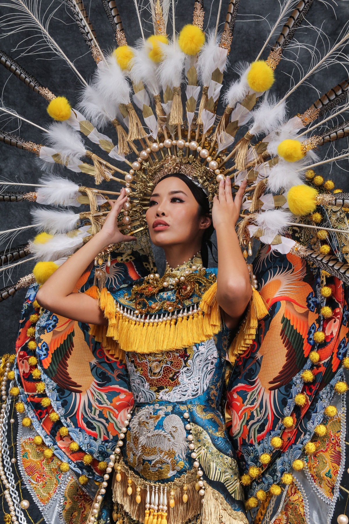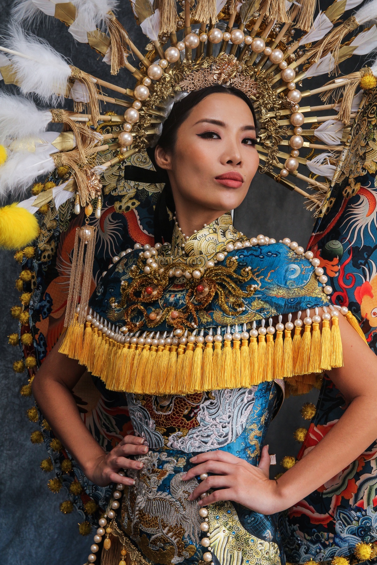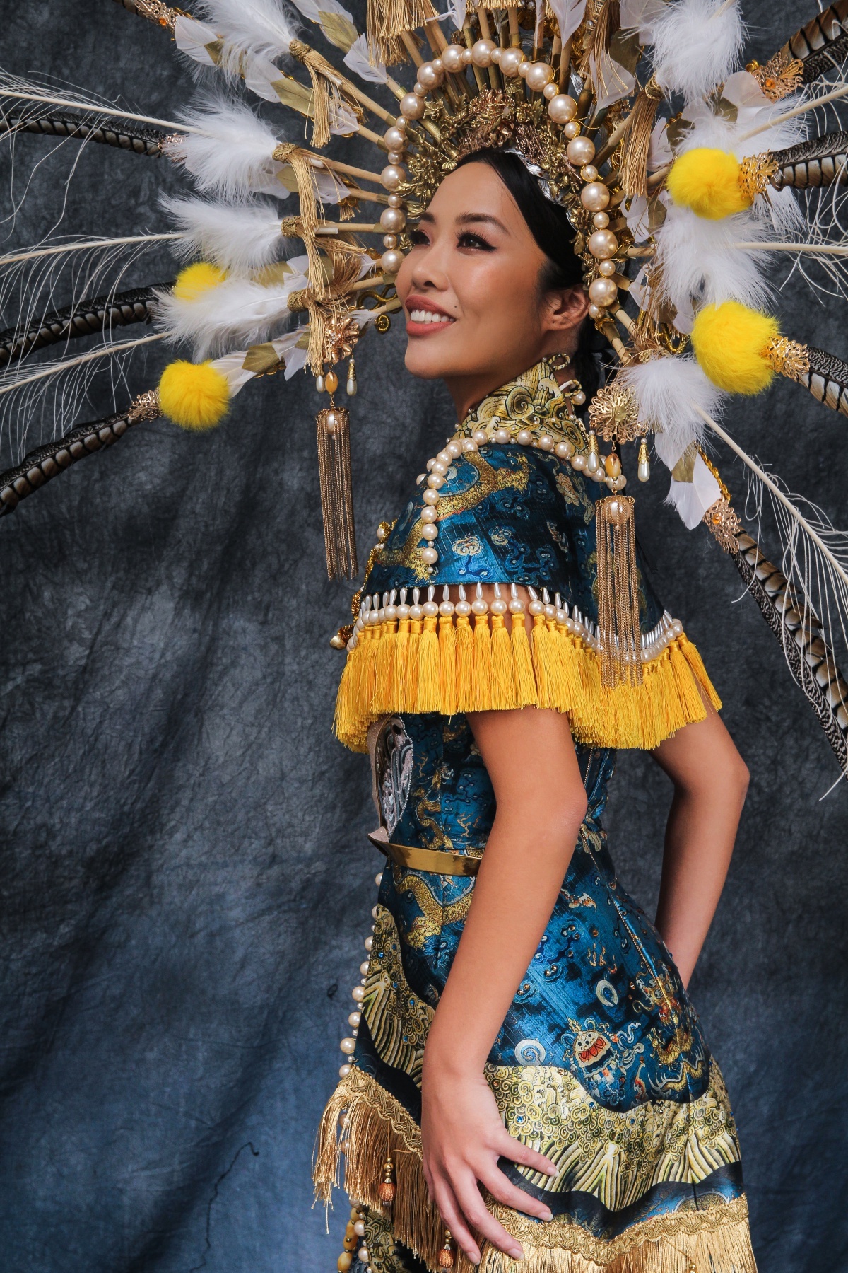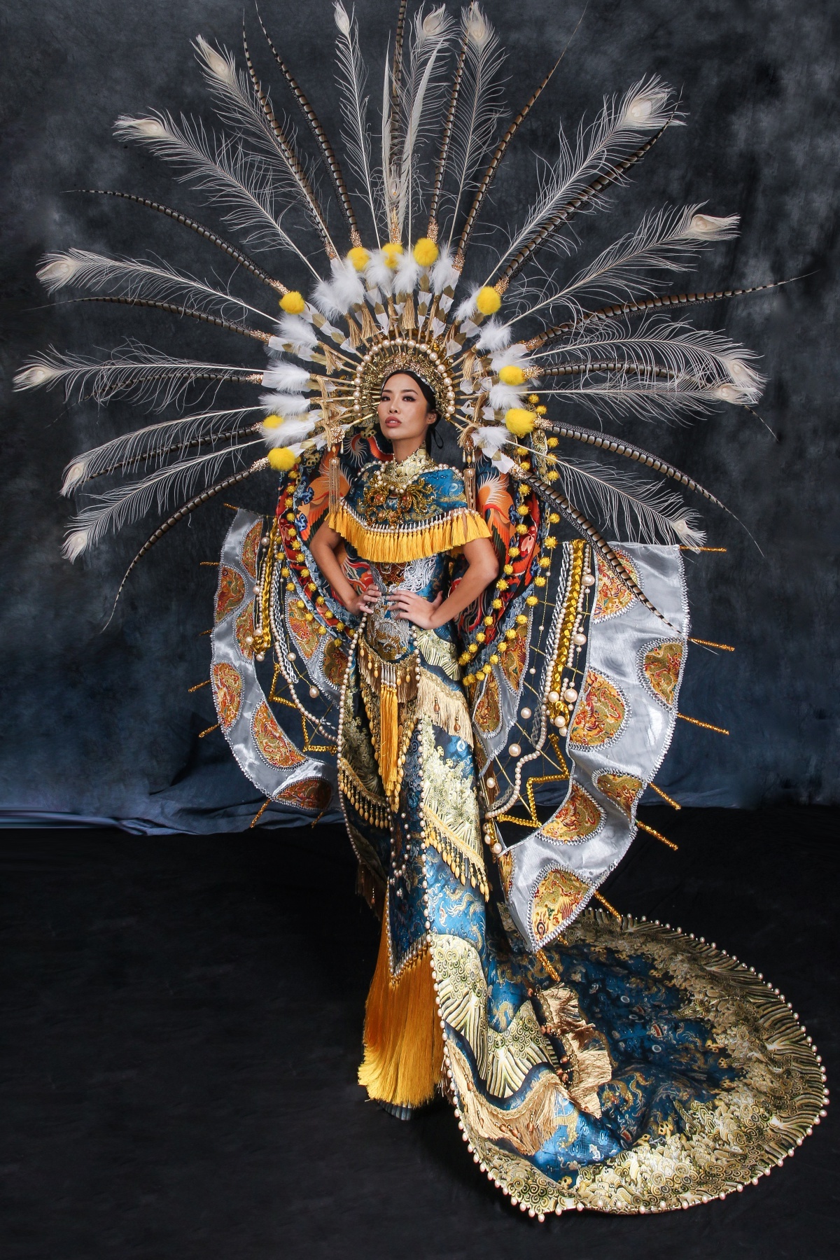 Lấy cảm hứng từ tuồng cổ - bộ môn nghệ thuật truyền thống của Việt Nam. Thiết kế được tỉ mỉ chăm chút từng đường kim mũi chỉ từ mấn đội đầu cho đến đuôi váy dài đến 3 mét. Theo chia sẻ từ phía ê-kíp, bộ trang phục cao tới 3,2 m và nặng 40 kg - đây là một con số khá ấn tượng đối với những bộ trang phục truyền thống được nhiều người đẹp chọn lựa mang đi chinh chiến tại đấu trường sắc đẹp quốc tế.