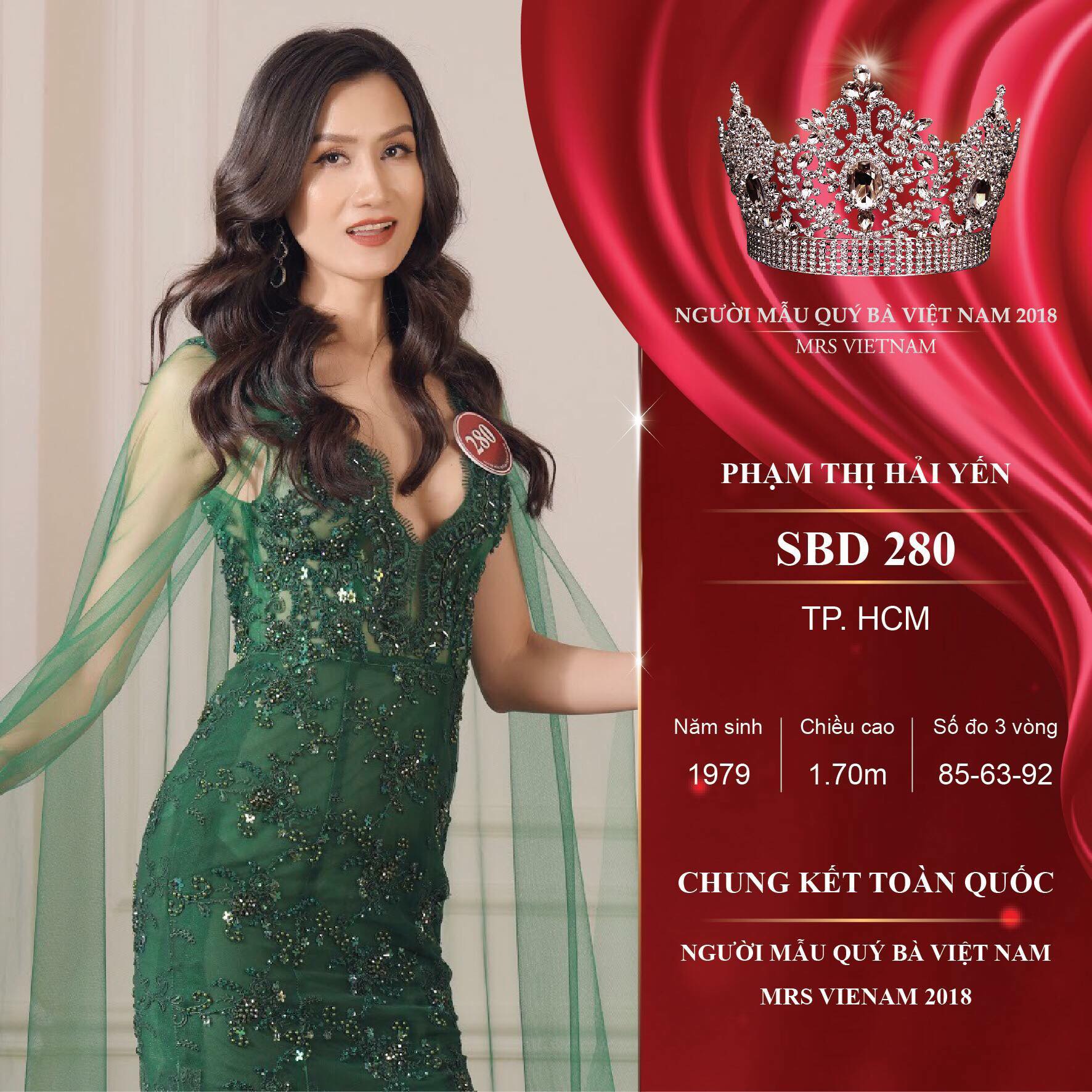 Mới đây Phạm Thị Hải Yến lên á quân 1 tại Mrs Vietnam 2018 (Người mẫu Quý bà Việt Nam). Đây là cuộc thi nhan sắc cấp quốc gia lớn và uy tín dành cho các quý bà.